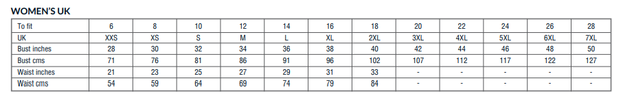 | Bust (ins) | 28 | 30 | 32 | 34 | 36 | 38 | 40 | 42 | 44 | 46 | 48 | 50 |