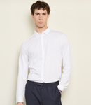 100% mercerised cotton. Italian spread collar. Self colour buttons. Back yoke. Two button adjustable cuffs with button on cuff gauntlet. Curved hem. Unbranded size label.