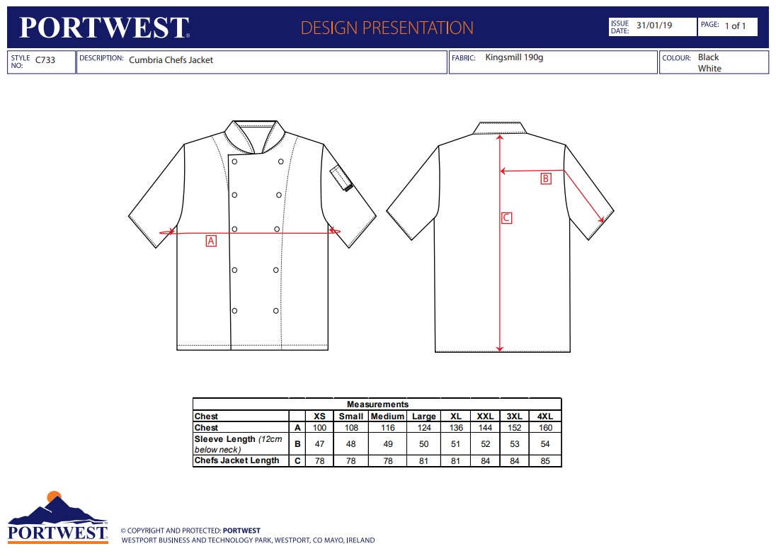 Portwest C733 Cumbria Chefs Jacket S/S C733