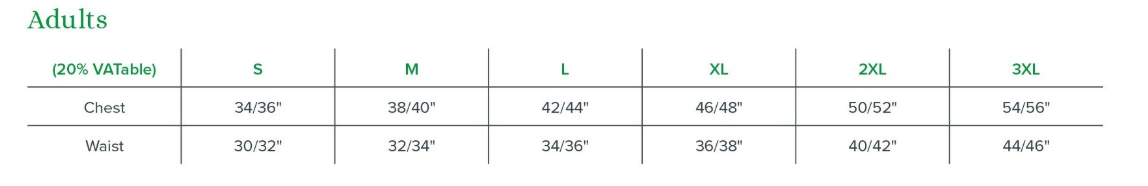 | Chest | 34 - 36 | 38 - 40 | 42 - 44 | 46 - 48 | 50 - 52 | 54 - 56 |