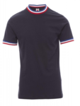 Men’s short-sleeved crew neck t-shirt, contrasting collar and sleeve edging (colours of the flag) 2.3 cm spandex mix rib neckband with top stitching on the front, shoulder-to-shoulder reinforcement tape. Stretch seams, side seams