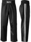 Suitable for all styles of Martial Arts. Incredibly comfortable during intense training sessions. Reinforced stitching and seams for durability. Black trousers with a contracting stripe of colour. Elasticated waist with additional tie for perfect fit. Polycotton
